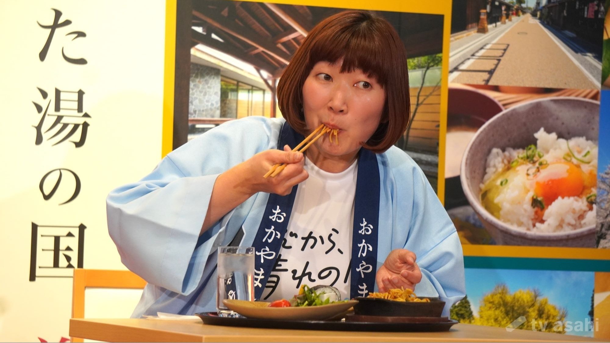 温泉好きの川村エミコは、はっぴ姿で登場した。
