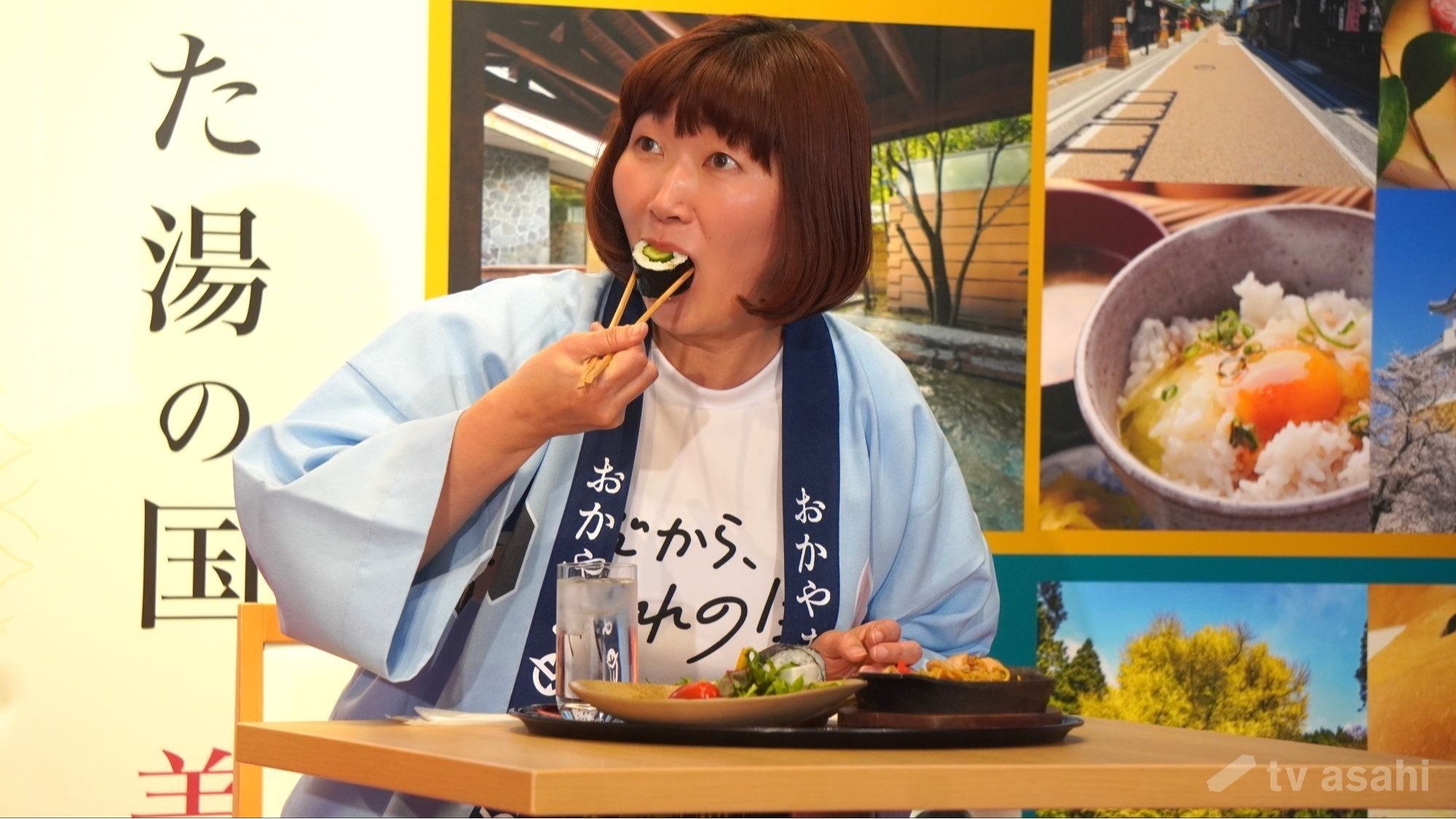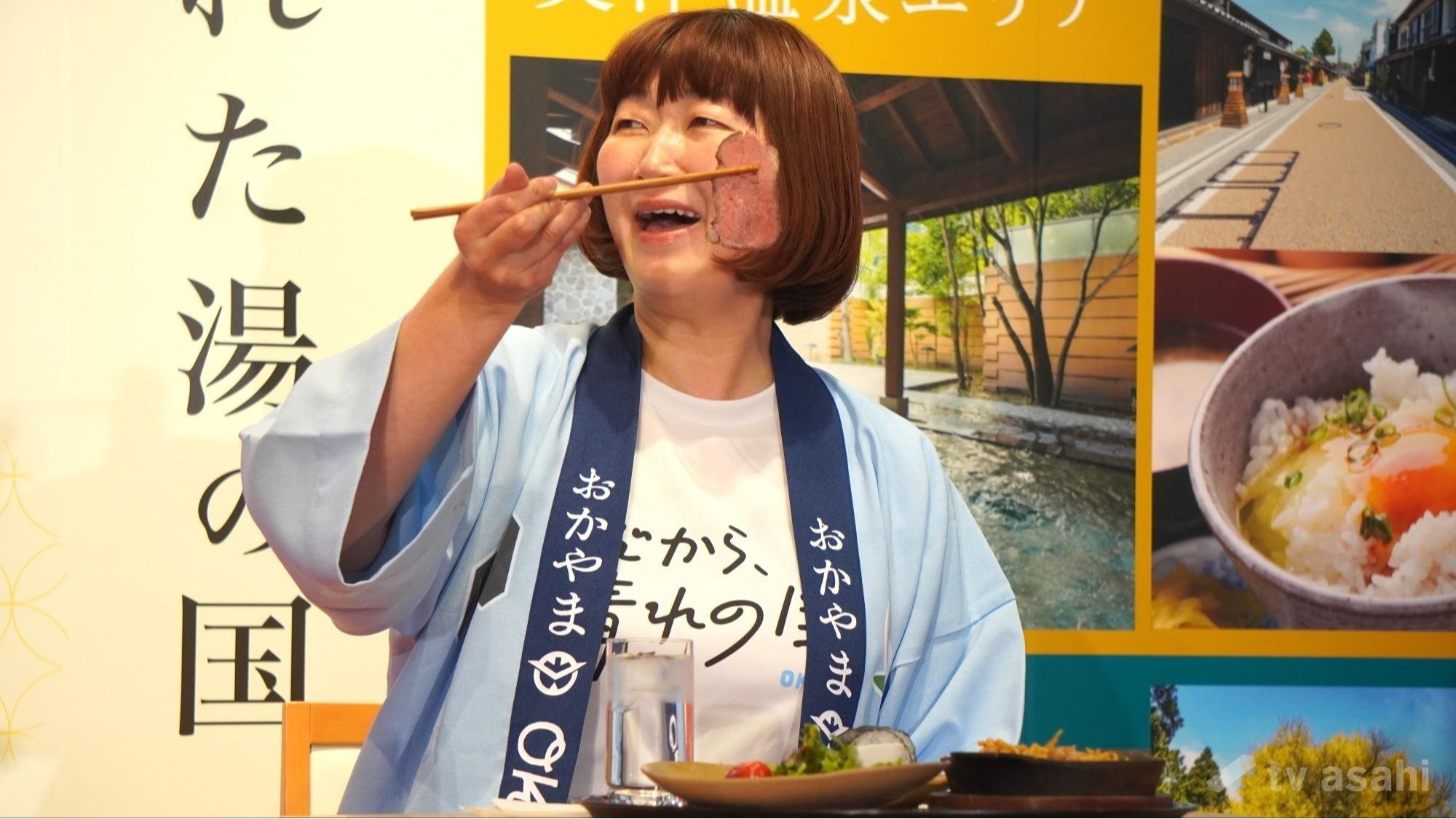 PRイベント「おかやま美作三湯めぐり」で提供されるメニューを試食。「かっぱのなみだ巻き」を食べると、「おいしい!」と言ったものの、わさびの辛さに涙が出そうになっていた。