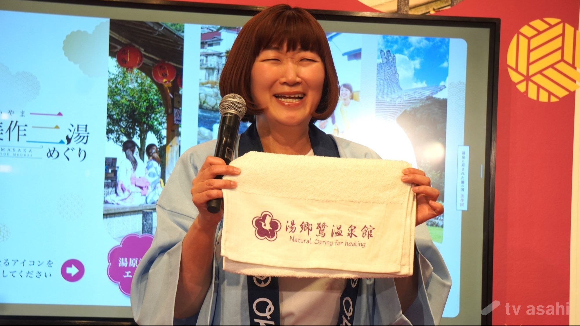 岡山県の“美作三湯”を巡った際に買ったタオルを見せる場面も。