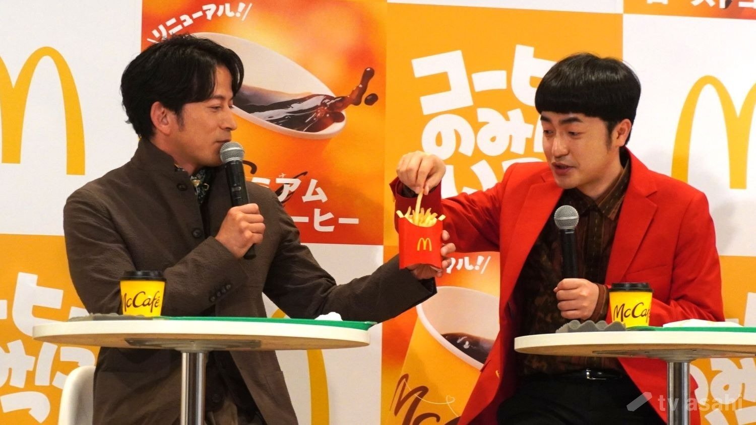 マクドナルドの「プレミアムローストコーヒー」(ホット)が3年ぶりにリニューアル。岡田准一はコーヒーとともにポテトを試食し、「たくろう」の赤木裕にも「いる?」とおすそ分けした。