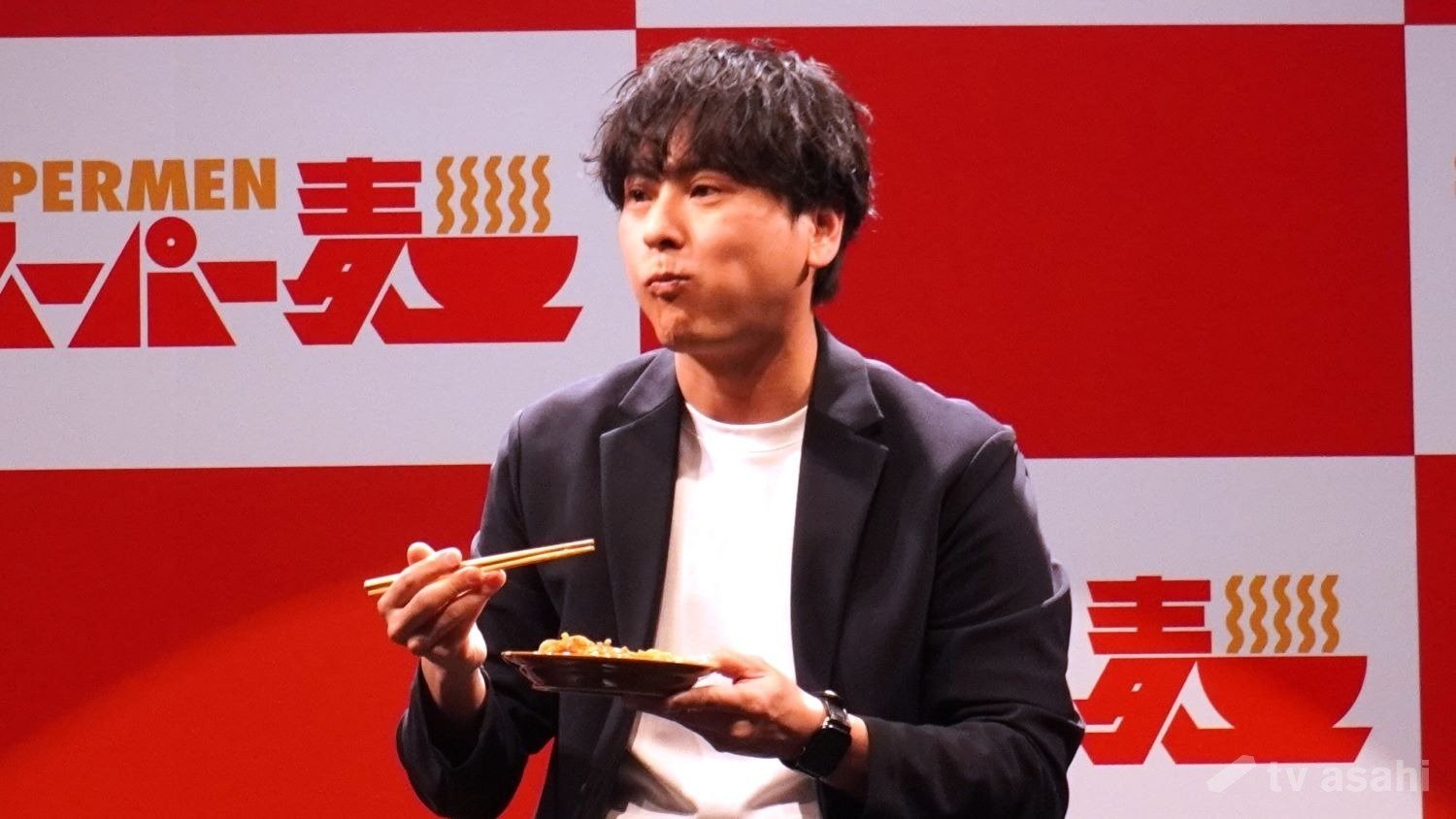 山下健二郎は自身考案のオリジナルレシピ「黒胡椒焚き火スーパー麺」「濃厚黒胡麻スーパー担々麺」を試食。豪快な食べっぷりだった。
