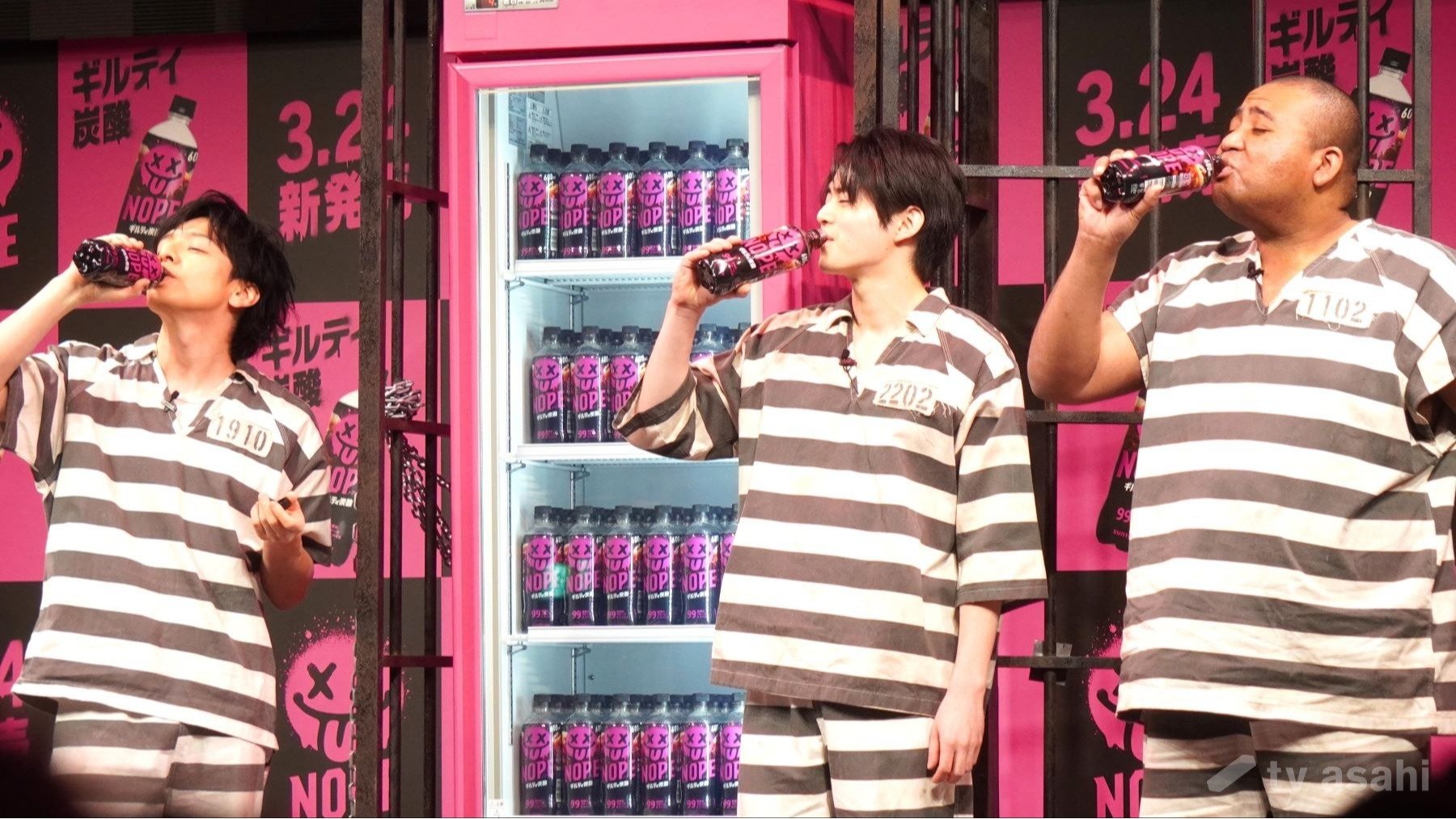 発売に先駆け、「ギルティ炭酸NOPE」で乾杯!3人はゴクゴクおいしそうに飲んでいた。