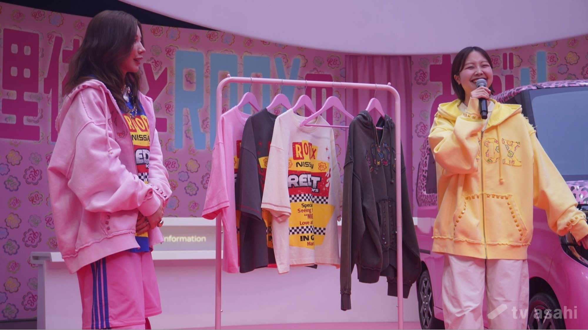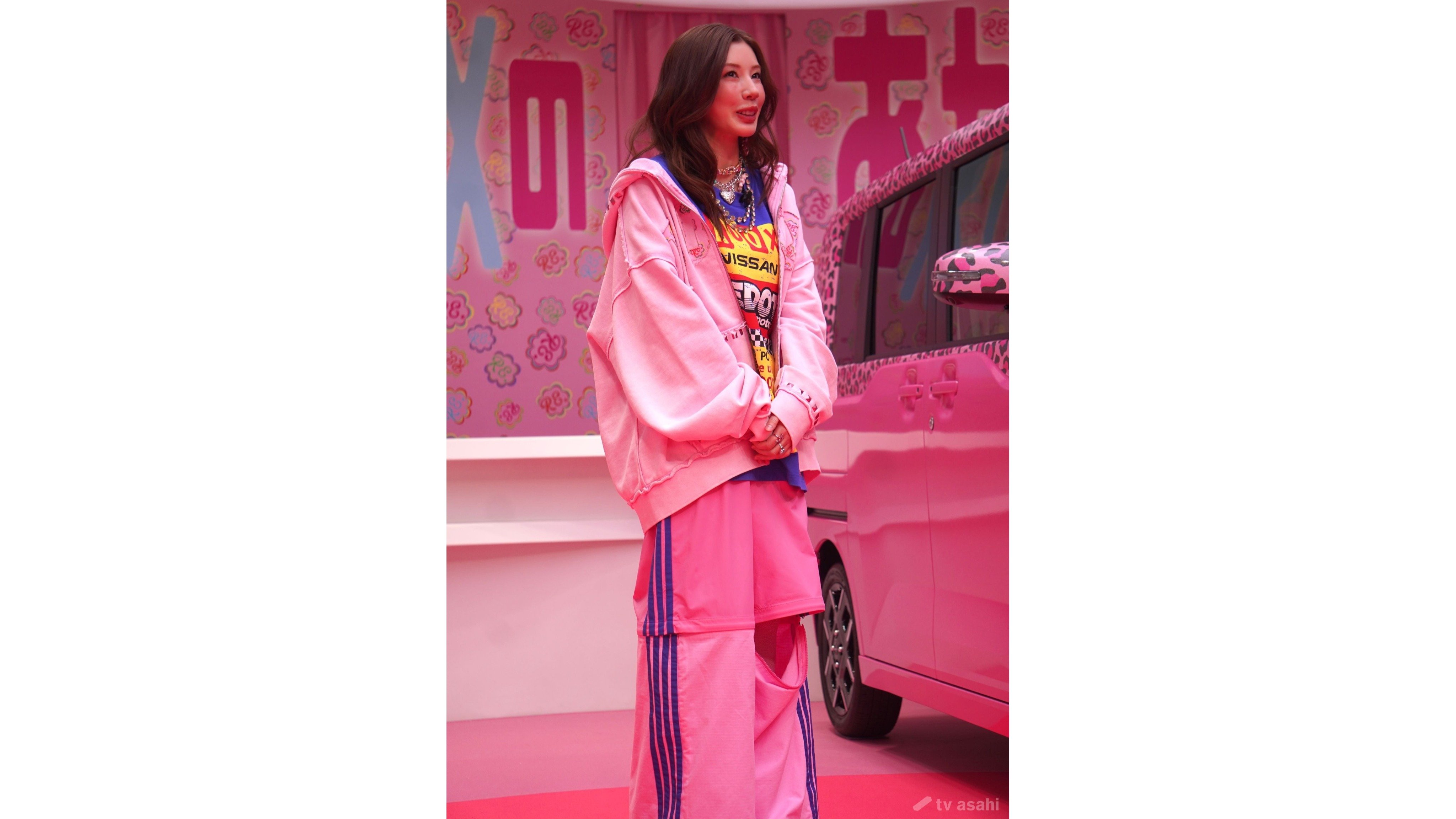 取材会では、イベント会場で買えるグッズとして、「RE.」と「日産ルークス」のコラボパーカがお披露目された。「私がデザインしました。どうしたら皆さんに私の世界観を伝えられるかなって考えた結果、こうなりました」とアピールし、「ピンクの生地をブリーチかけてツートーンっぽくしているんです」などと詳しく説明した。