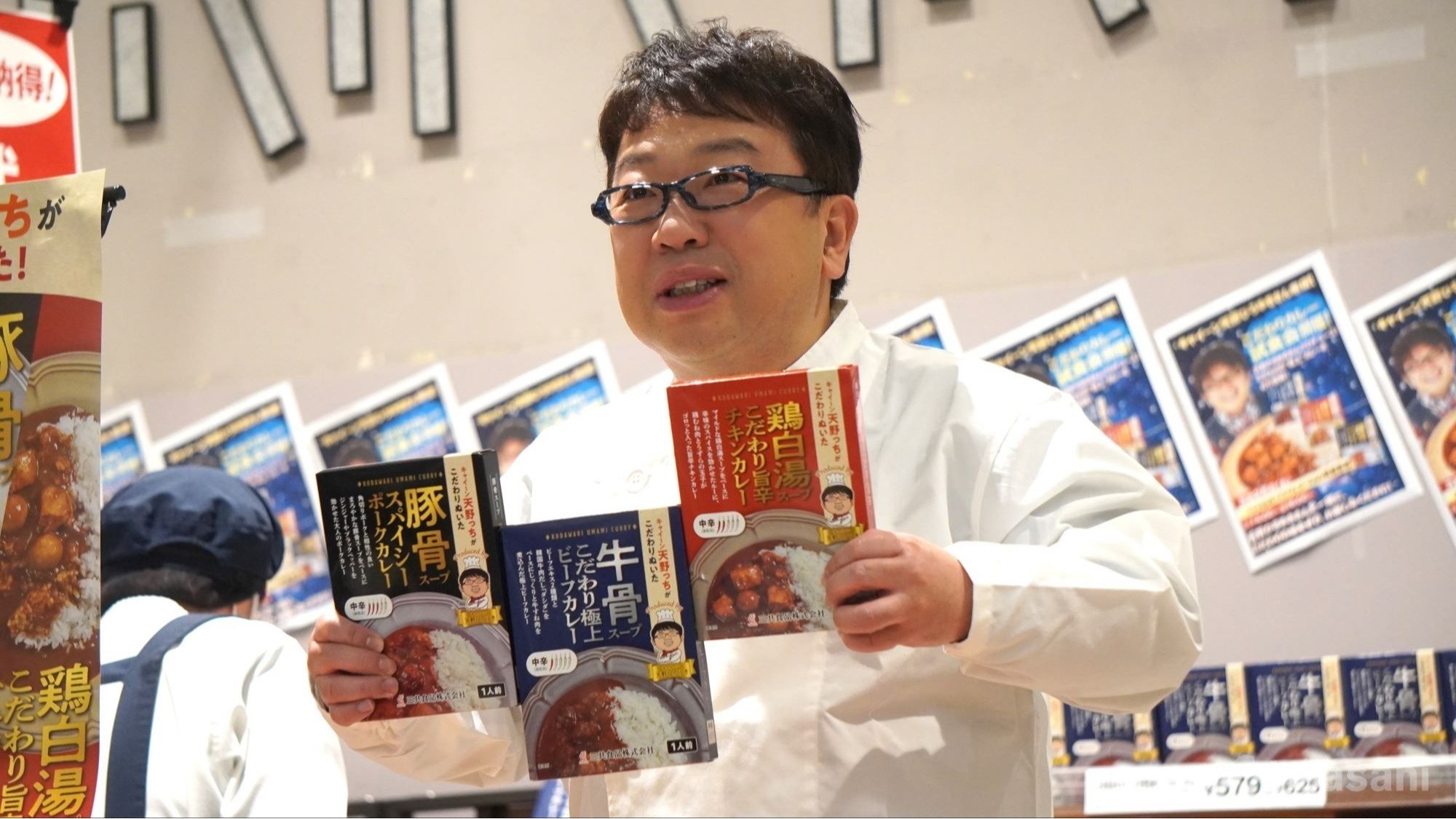 カレー好きの天野ひろゆきが、レトルトカレー「牛骨スープこだわり極上ビーフカレー」「豚骨スープスパイシーポークカレー」「鶏白湯スープこだわり旨辛チキンカレー」を発売する。フォトセッションでは、3つつなげて持ち、「(手を)離すと落ちます」と少しだけ手を離し、ひやひやさせる場面も…