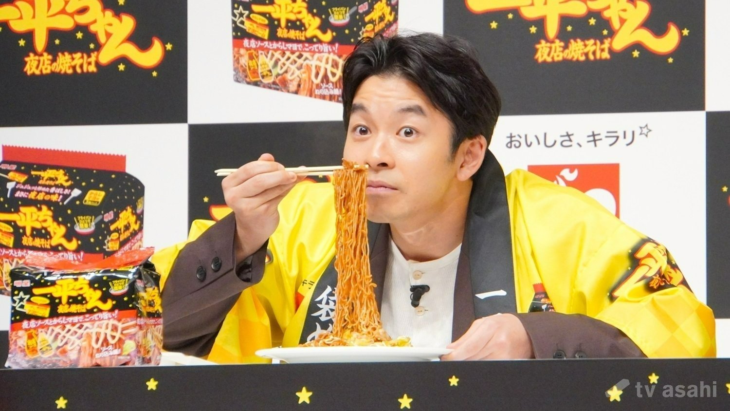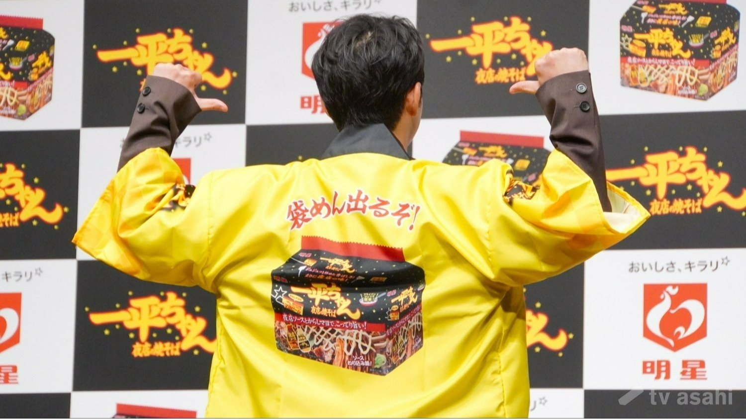 「焼そばカラー」という衣装で登場した仲野。法被をプレゼントされ、ポージングを披露した。くしくも法被は一平ちゃんの代名詞“からしマヨカラー”だった。