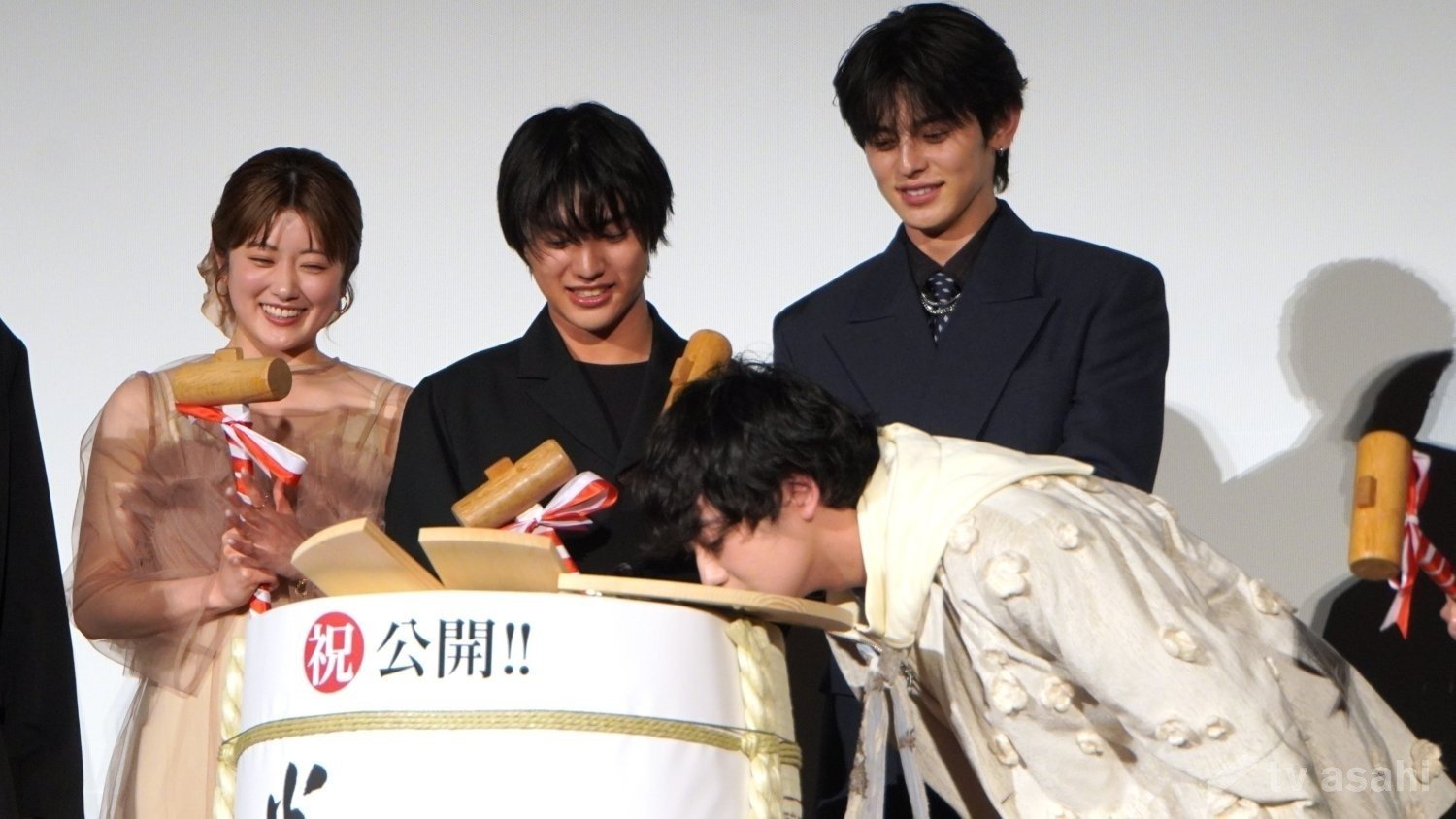 イベントの最後には鏡開きも実施。木槌で無事に酒樽が割れると、ゆうたろうは思わず匂いをかいでいた。ゆうたろうは今作で、蘆名家小姓で、盛隆の寵愛を受ける大庭三左衛門を演じた。