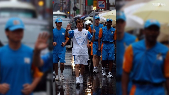 2004年6月、アテネ五輪聖火リレーで力走する橋幸夫さん(提供 朝日新聞社)