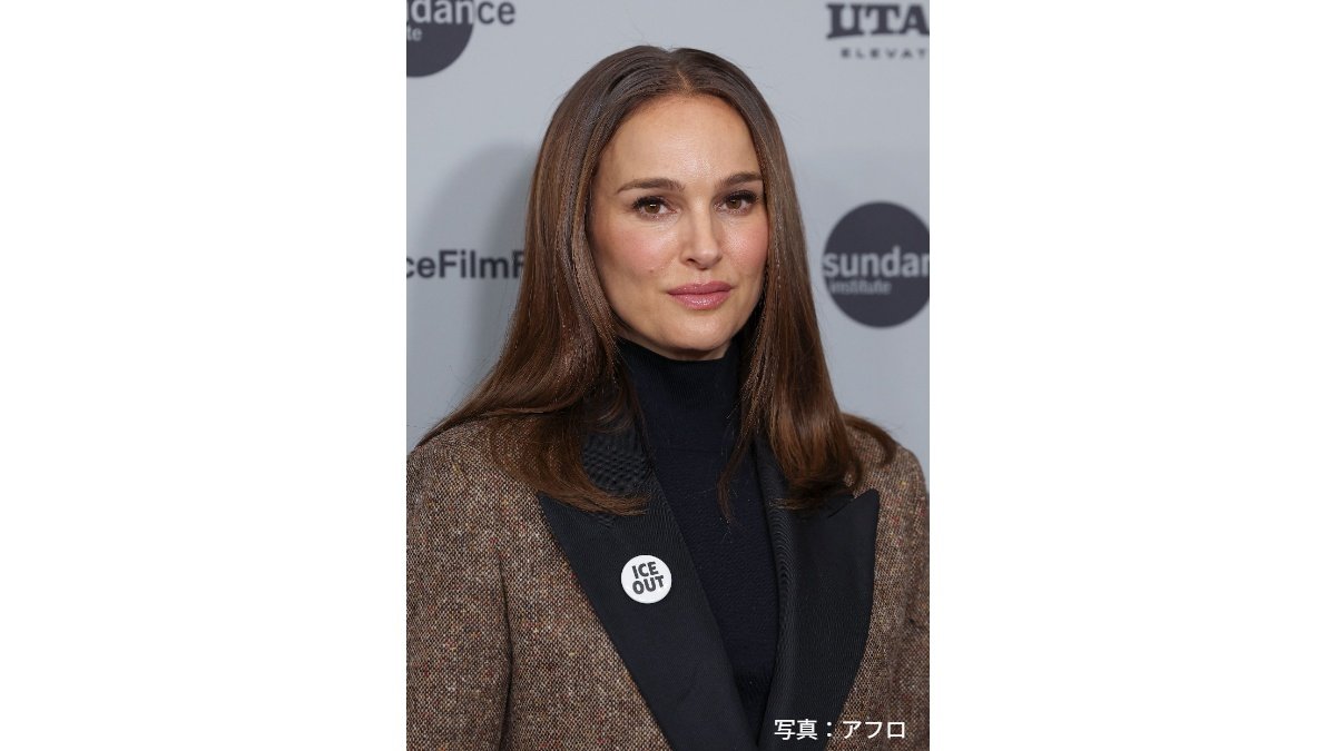 「ICE OUT」(ICEは出ていけ)と書かれたバッジをつけた女優のナタリー・ポートマン