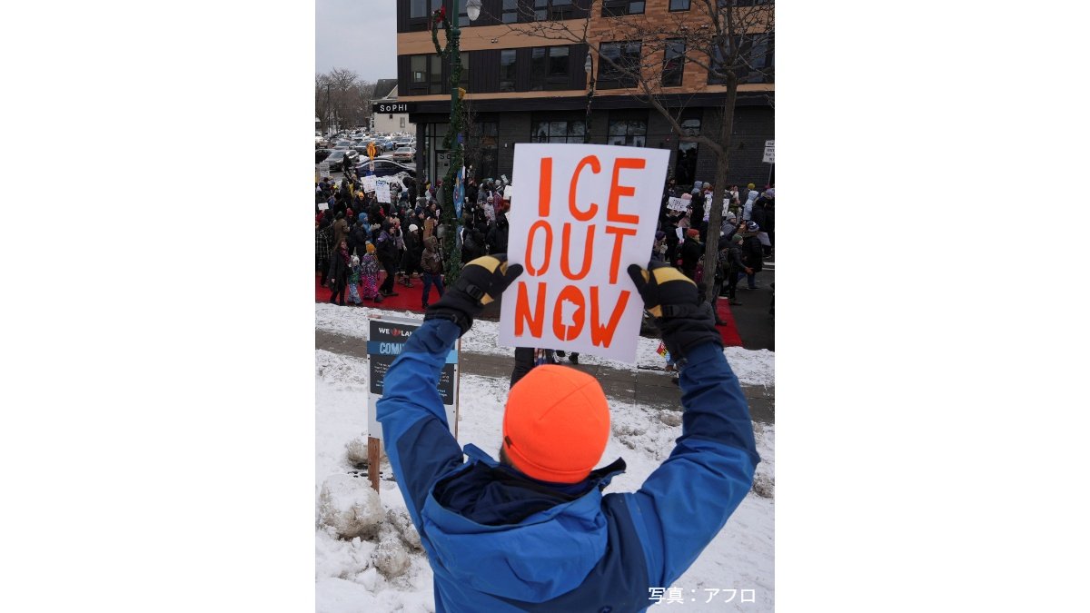 米ICE職員が市民2人射殺「ICEは今すぐ出ていけ」のプラカードを掲げて抗議