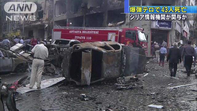 トルコ南部のレイハンルの中心部で午後、市の庁舎と郵便局の前に止めてあった車2台が突然、爆発しました。自動車に積んだ爆弾を遠隔操作で爆発させたとみられていて、43人が死亡し、140人以上が負傷しました。犯行声明などは出ておらず、トルコ政府はシリアの情報機関による爆弾テロの可能性を示唆しています。レイハンルはシリアとの国境の町で、トルコがアサド政権の反体制派を支援しているため、アサド政権との対立が深まっています。