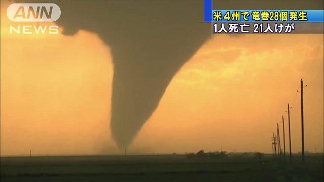 アメリカのオクラホマ州などで19日、巨大な竜巻が多数発生しました。各地で建物が吹き飛ばされるなどの被害が出ていて、1人が死亡し、21人がけがをしました。