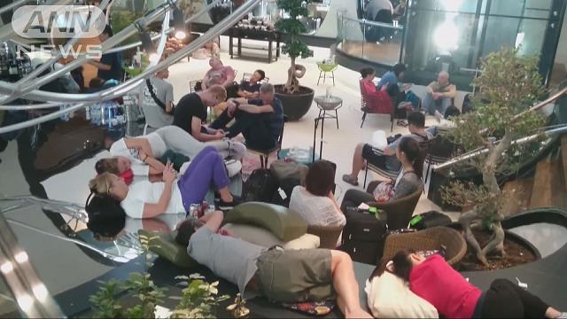 空港内のラウンジの中は深夜に発砲音や炸裂音が聞こえて、一時、騒然としました。時間が経って徐々に落ち着きを取り戻しています。フロアでは地元のクーデターに関するニュースを注意深く見ている人や本当に疲れ果てて床で寝ている人も多数、見受けられます。そして、ラウンジの入り口のカウンターでは、係員に代替便について詰め寄っているような姿も見受けられます。