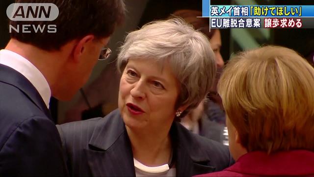 信任投票から一夜明けた13日、ブリュッセルでEU首脳会議に出席したメイ首相は各国首脳からねぎらいを受けました。会議でメイ首相は、離脱後もEUの影響を受け続ける可能性があるとして国内で強い反発を受けている現行の合意案について「もう後がない。助けてほしい」と訴え、EU側の譲歩を求めました。しかし、EUのユンケル委員長は「合意の内容をより明確にすることはできるが、再交渉はしない」と訴えを拒否しました。メイ首相にとって依然、厳しい状況が続いています。