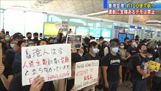 香港の空港では13日に市民らが出発ゲート前を占拠し、夕方以降の出発便がすべて欠航しました。運航は14日朝に一部が再開されましたが、約100便が欠航する見込みです。空港当局は運航に支障が出るエリアのデモ行為を禁止する方針を決めました。一方、アメリカのトランプ大統領は「中国政府が中国本土と香港の境界線に部隊を動かしつつあると情報機関から報告を受けた」と明らかにしています。