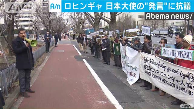 日本に住むミャンマーの少数民族「ロヒンギャ」の人たちが外務省の前に集まり、日本の大使が「ミャンマー軍は大量虐殺に関与していない」と発言したことに抗議しました。