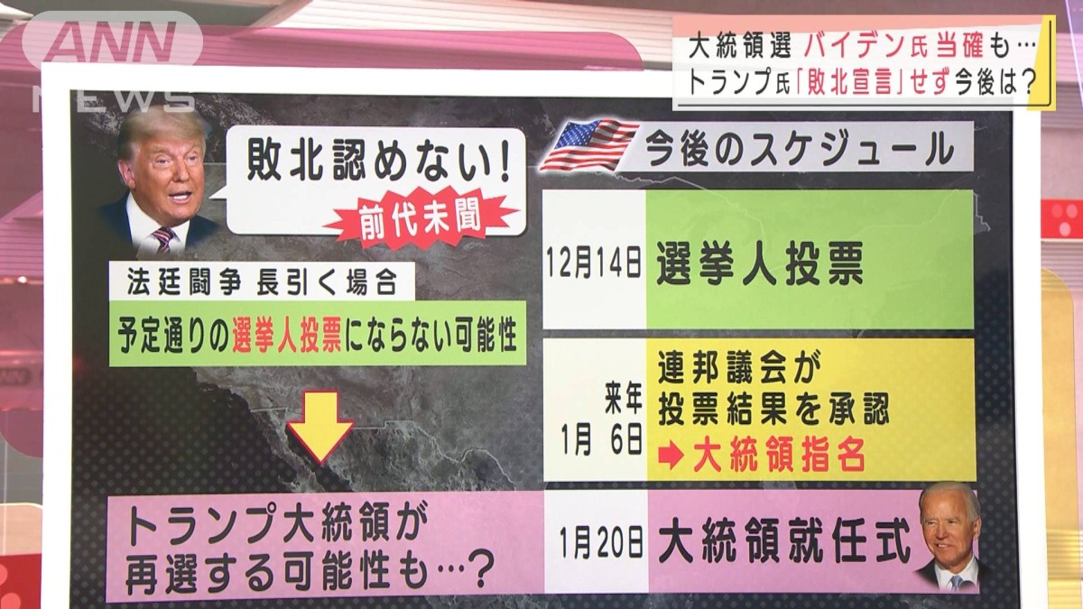 予定されている今後のスケジュールを確認していくと、来月14日に各州の選挙人による投票を経て、来年1月6日に連邦議会が投票結果を承認して大統領を指名となります。1月20日に大統領の就任式が予定あり、すんなり行けば「バイデン新大統領」が誕生となります。ただ、トランプ大統領が「敗北宣言」をしない「前代未聞」の事態となっていて、このスケジュール通りとはいかない場合もあります。このまま法廷闘争という「異例の事態」が続けば、各州で選ばれる「選挙人の投票」が予定通りに行えないことも考えられます。その場合、トランプ大統領が再選する可能性もわずかながら残されています。