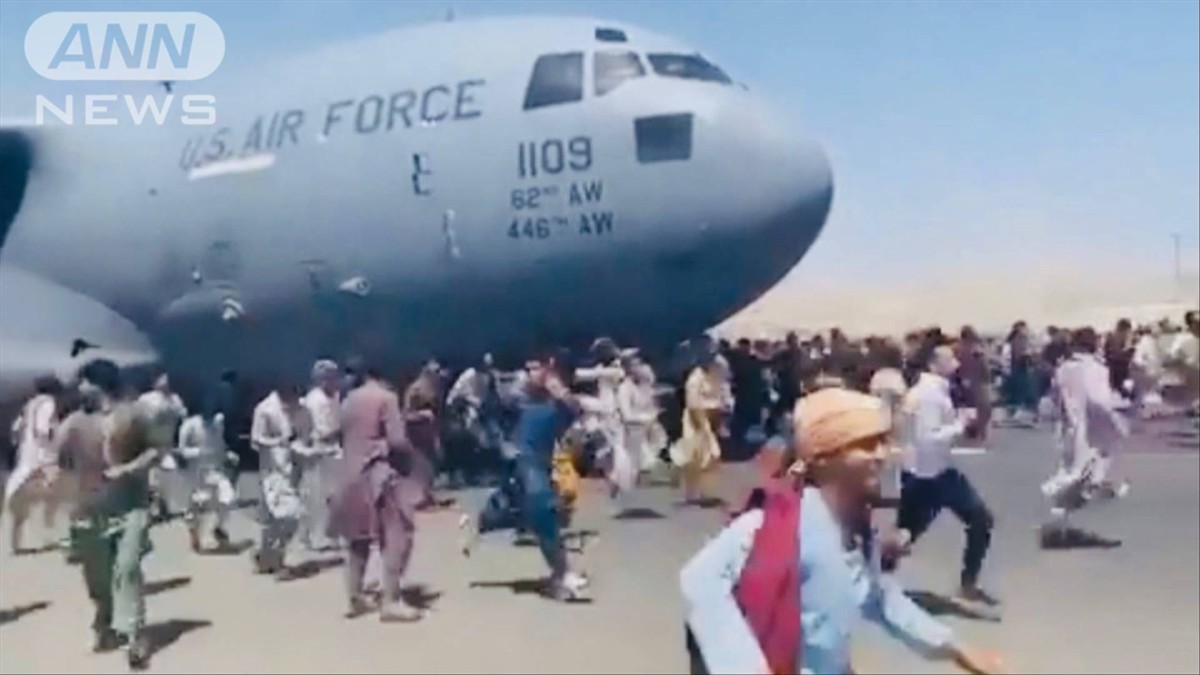 空港の様子を映したとみられるSNS上の映像には、荷物も持たず着の身着のままのアフガン人たちが輸送機に乗り込もうと押し寄せる様子が映し出され、警備にあたる米軍部隊のものとみられる、「退がれ」という怒号に、威嚇射撃のような音が響く。