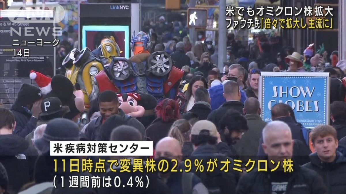 アメリカ疾病対策センターが14日に明らかにしたデータによりますと、11日時点でアメリカで流行している変異株のうち、2.9%がオミクロン株だと推定されるということです。