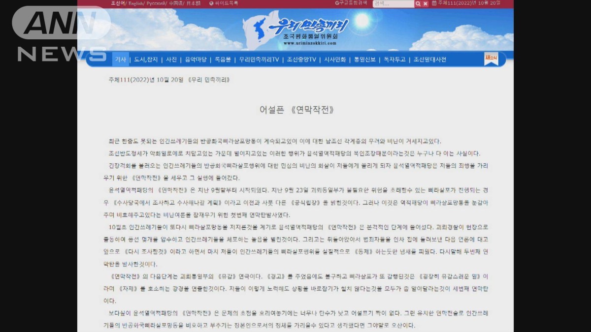 北朝鮮は20日、対外サイト「わが民族同士」を通じ、脱北者による韓国からの風船を使った反体制ビラの散布に関連した声明を発表しました。