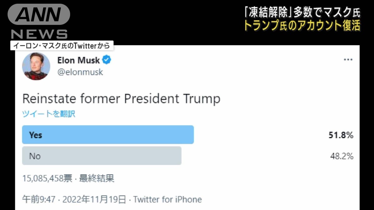 マスク氏は凍結解除をするべきかどうか投票を呼び掛けていましたが、24時間でおよそ1500万票が集まり、解除に「賛成」が51.8%で、「反対」を上回ったとしています。