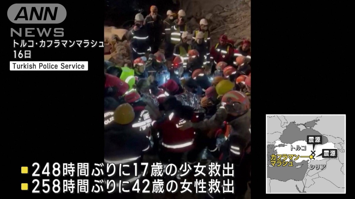 震源近くの町カフラマンマラシュでも248時間ぶりに17歳の少女が救出され、その10時間後に42歳の女性が助け出されました。