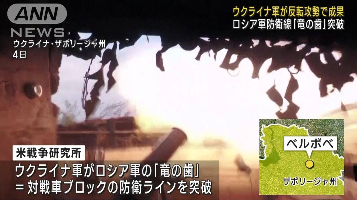 アメリカの戦争研究所によりますと、ウクライナ軍は南部ザポリージャ州のベルボベ付近で、ロシア軍が敷設した「竜の歯」と呼ばれる対戦車ブロックの防衛ラインを突破し、町の中心部に迫っています。