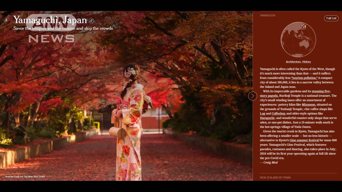 アメリカのニューヨークタイムズが「2024年に行くべき52カ所」を発表し、3番目に山口市が選ばれました。