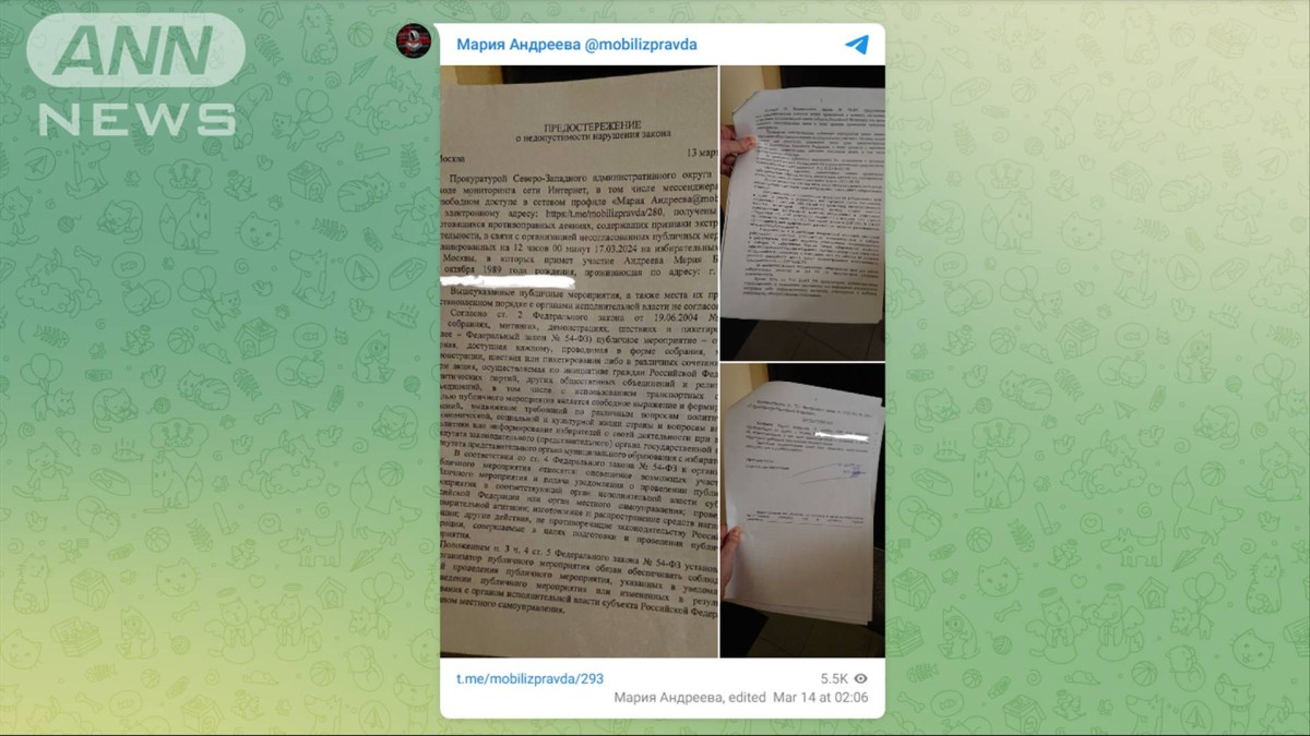 動員兵の妻らの運動「プーチ・ダモイ」のマリア・アンドレーワさんは13日、検察当局から17日正午に投票所に行けば刑事責任を問われる可能性があると警告を受けたことを明かしました。