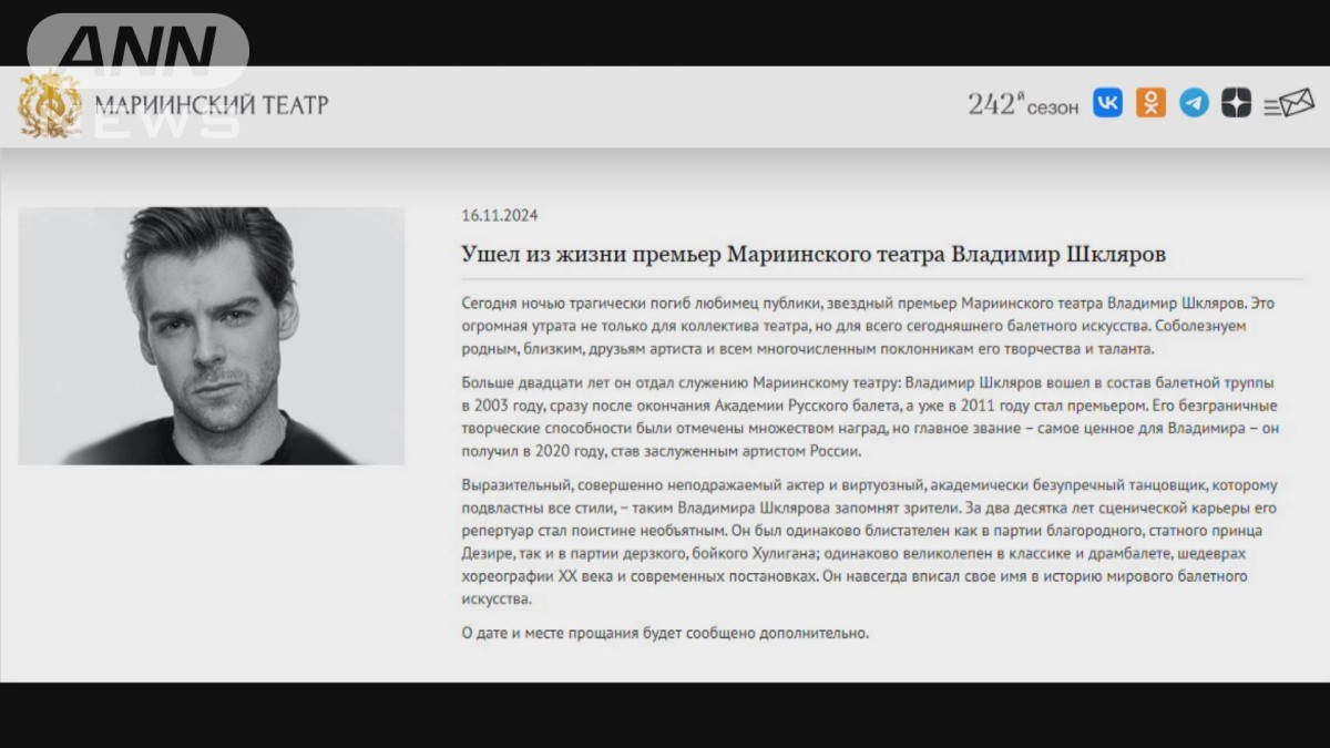 マリンスキー劇場は16日、シクリャロフさんが死去したと発表しました。