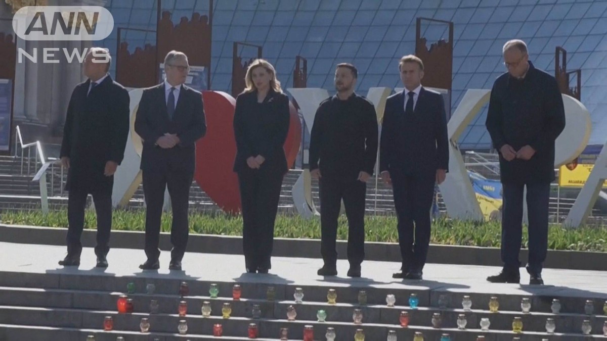 別の列車で到着したポーランドのトゥスク首相も合流し、中心部にある独立広場を訪れ、ゼレンスキー大統領とともに戦没兵士に祈りを捧げました。