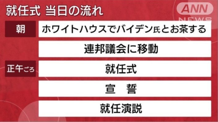 朝、ホワイトハウスでバイデン大統領と次期大統領のトランプ氏が慣例に沿ってお茶を飲みます。バイデン大統領が招待しました。その後、連邦議会に移動し、正午ごろに式がスタートします。副大統領になるJ・D・バンス氏が宣誓した後にトランプ氏が宣誓をして、正式に政権の発足となります。就任式では歌手が国歌を歌うパフォーマンスもあります。そのあと、予定されていた議会からホワイトハウスまで歩くパレードの代わりに、室内で就任を祝う国民に直接あいさつします。