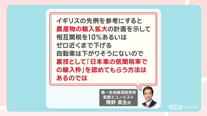「イギリスの先例を参考にすると、農産物の輸入拡大の計画を示して相互関税を10%あるいはゼロ近くまで下げる。自動車は下がりそうにないので、裏技として『日本車の低関税率での輸入枠』を認めてもらう方法はあるのでは」