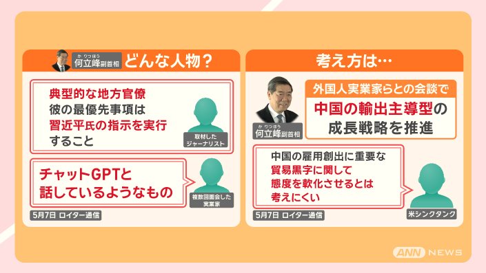 考え方については、何立峰副首相は、外国人実業家との会談で、中国の輸出主導型の成長戦略を推進すると主張しているということです。