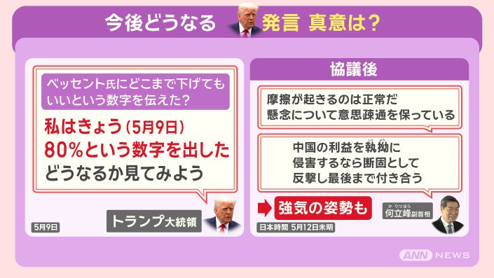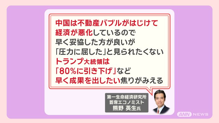 「中国は不動産バブルがはじけて経済が悪化しているので、早く妥協した方が良いが、『圧力に屈した』と見られたくない。トランプ大統領は『80%に引き下げ』など、早く成果を出したい焦りがみえる」