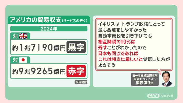 「イギリスは、トランプ政権にとって最も合意をしやすかった。自動車関税を引き下げても相互関税の10%は残すことがわかったので、日本も同じであれば、これは相当に厳しいと覚悟した方がよさそう」