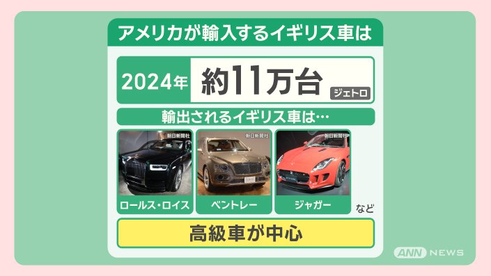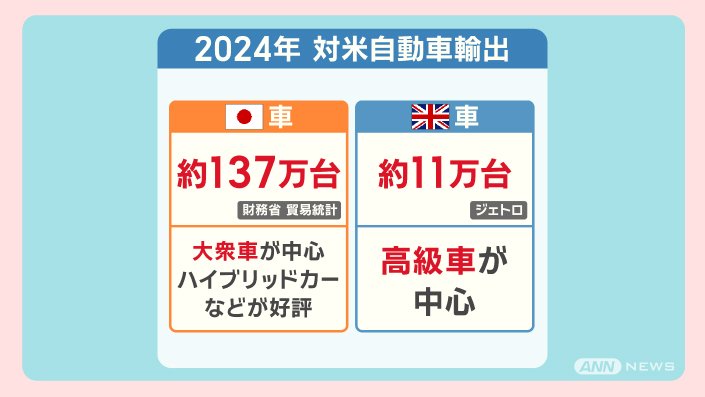 アメリカが2024年輸入した自動車約769万台のうち、イギリス車はわずか1.4%ほど。