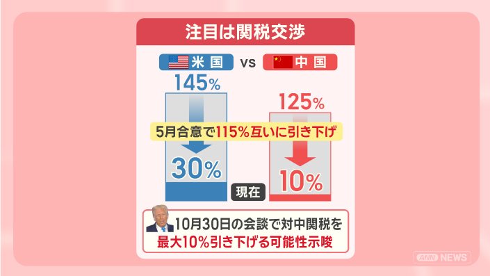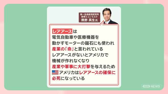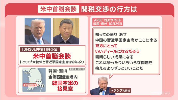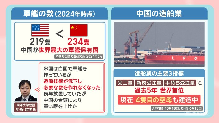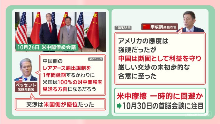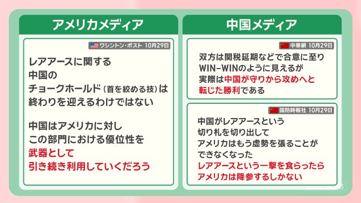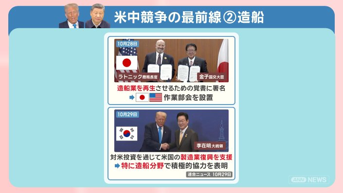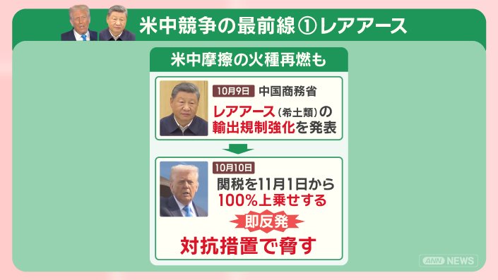 国際 モーニングショー 2025年10月30日 16:00 米中首脳会談 『レアアース規制』と『対中関税』焦点に 両国の思惑は? 広告 1■米中首脳会談 関税交渉に注目 対立の行方 この記事の写真は12枚 ■貿易摩擦の火種 レアアースvs関税 米中どちらが折れた? ■『造船』巡る米中競争 トランプ政権 焦りのワケ (「羽鳥慎一モーニングショー」2025年10月30日放送分より) 広告 スクープ投稿 トップ 国際 アメリカ 記事