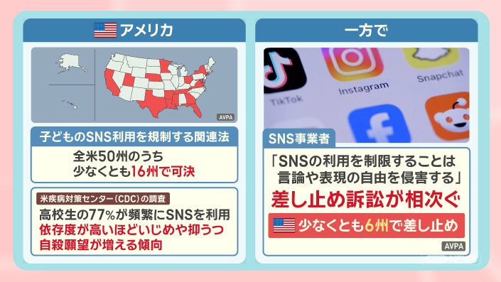 「SNSの利用を制限することは、言論や表現の自由を侵害する」という差し止め訴訟が相次いでいて、アメリカで、少なくとも6州で施行が差し止められました。
