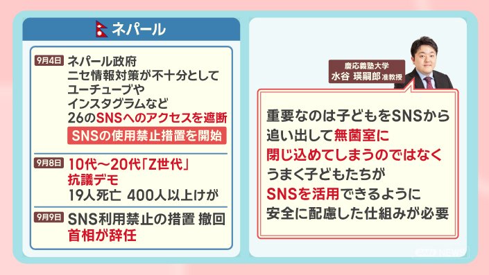 また、ネパールでは、9月4日に、政府が、ニセ情報対策が不十分だとして、『ユーチューブ』や『インスタグラム』など、26のSNSへのアクセスを遮断しました。