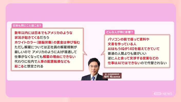 「数年以内には、日本でもアメリカのような状況が起きてくるだろう。ホワイトカラー(頭脳労働)の賃金は伸び悩む。ただし、解雇については、正社員の解雇規制が厳しいので、アメリカのようにAIが浸透して仕事がなくなっても解雇の理由にできない。代わりに社内で人事の配置転換なども起こると想定される」