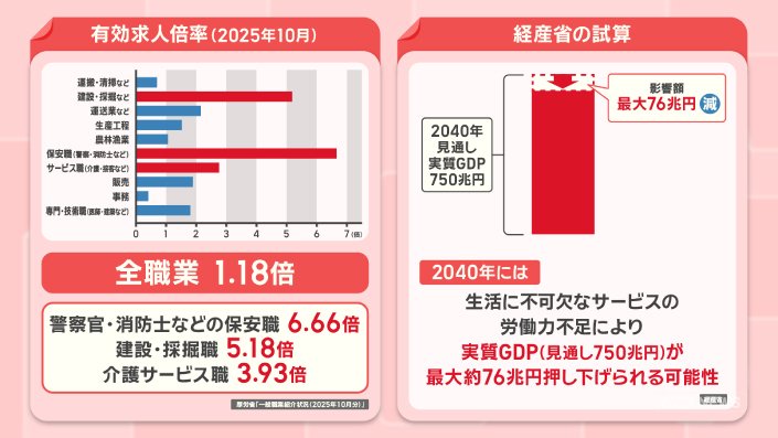 経産省の試算では、このまま人手不足が進行した場合、2040年には、生活に不可欠なサービスの労働力不足により、実質GDPが見通し額の750兆円から、最大約76兆円押し下げられる可能性があるとしています。