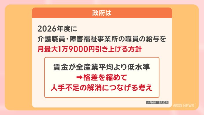 また、政府は、2026年度に、介護職員・障害福祉事業所の職員の給与を月最大1万9000円引き上げる方針です。