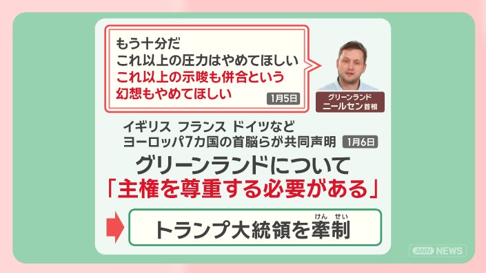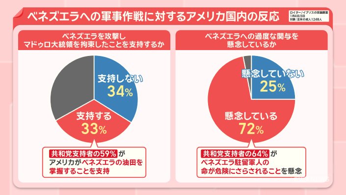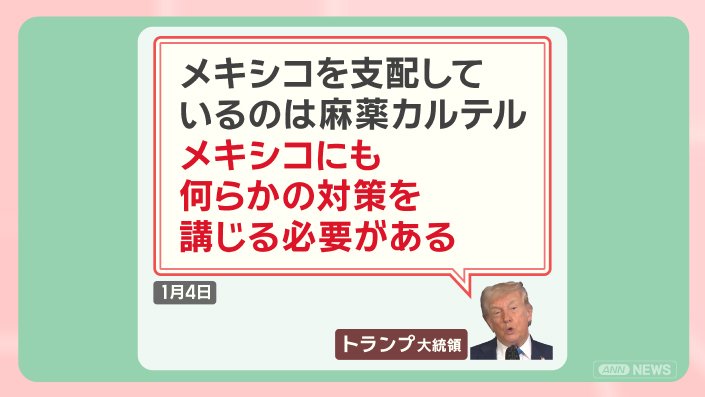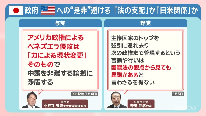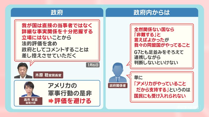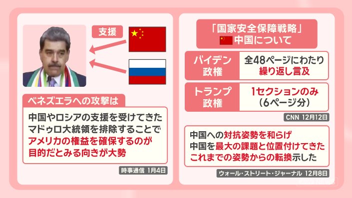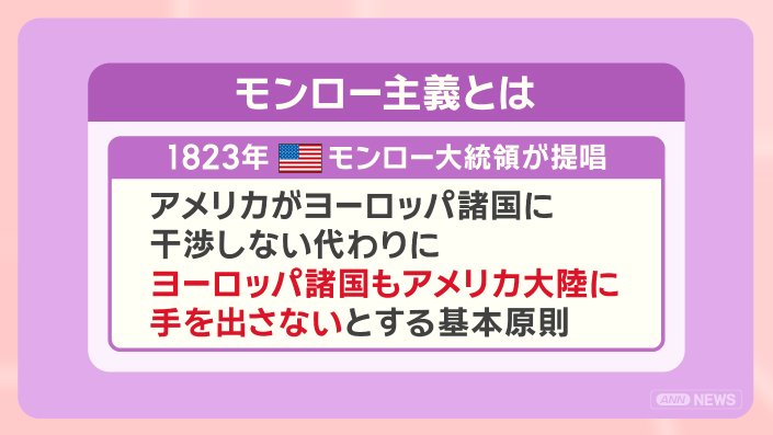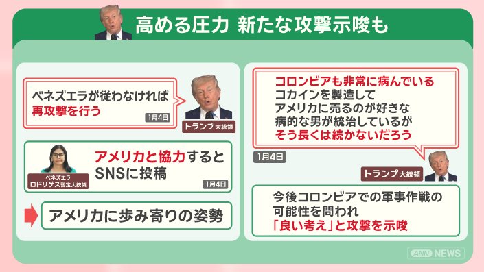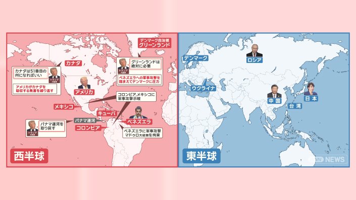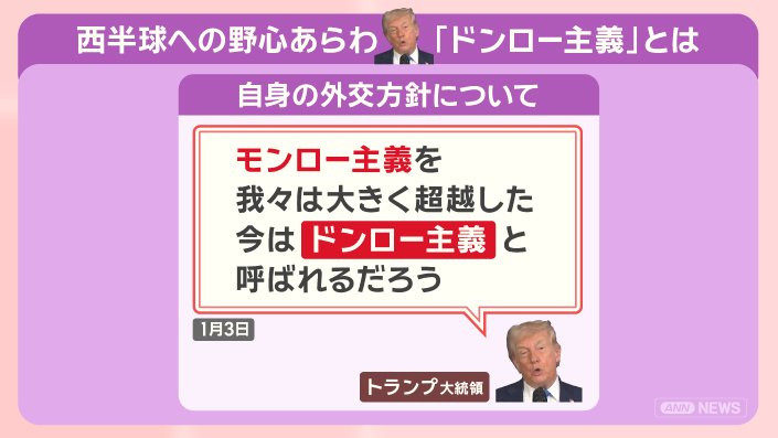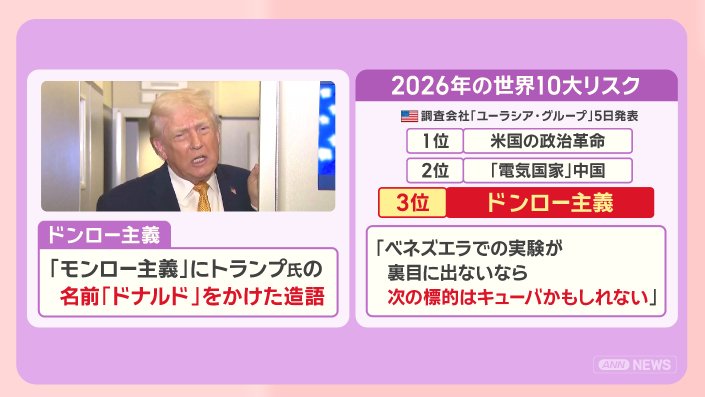国際 モーニングショー 2026年1月7日 16:00 トランプ氏 ベネズエラの“次の標的”西半球へ野心 外交方針“ドンロー主義”とは 広告 1■さらなる攻撃も?トランプ氏 ベネズエラの次の標的は… この記事の写真は20枚 ■トランプ氏 外交方針“ドンロー主義”とは 西半球支配に野心 ■“西半球重視”で対中関係に異変 台湾問題 関与せず? ■ベネズエラ攻撃 日本政府“評価回避”のワケ (「羽鳥慎一モーニングショー」2026年1月7日放送分より) 広告 スクープ投稿 トップ 国際 記事