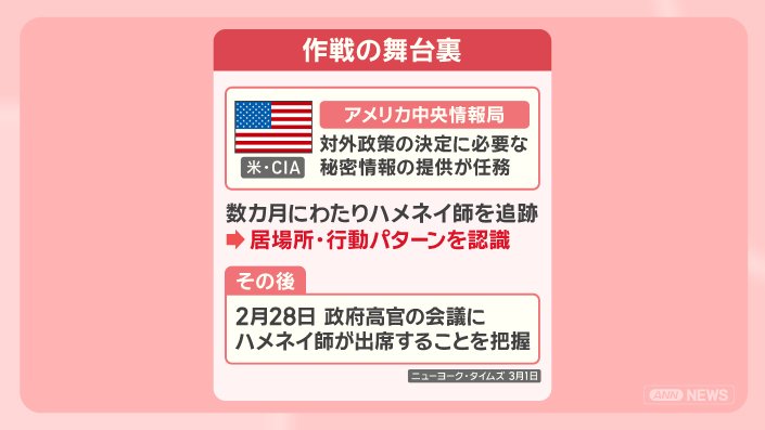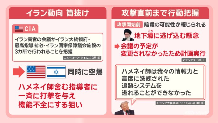 攻撃開始前には暗殺の可能性が報じられていて、ハメネイ師が地下壕に逃げ込むことも懸念されていましたが、会議の予定が変更されなかったため、計画は実行されたとしています。