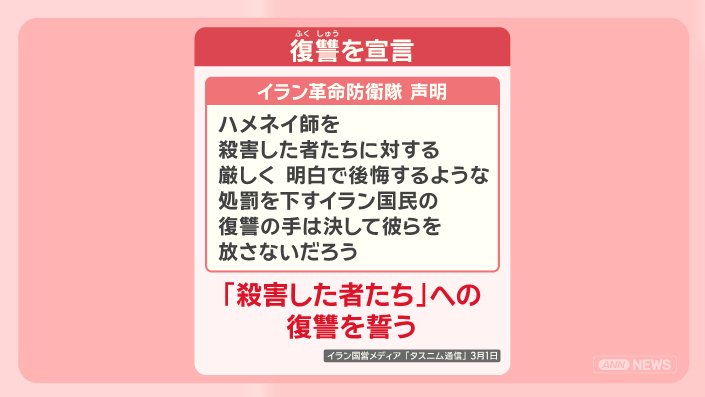 「ハメネイ師を殺害した者たちに対する厳しく 明白で後悔するような処罰を下すイラン国民の復讐の手は決して彼らを放さないだろう」と『殺害した者たち』への復讐を誓いました。