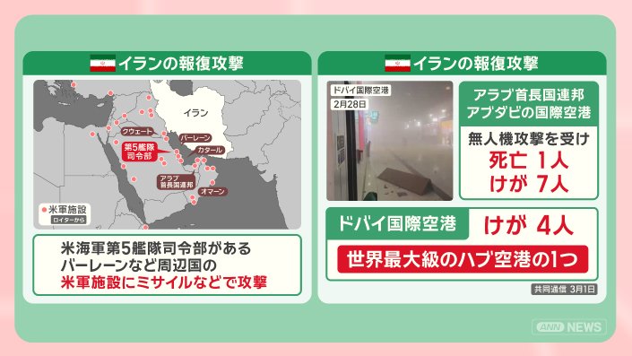 イランは、アメリカ海軍第5艦隊司令部があるバーレーン、クウェート、カタール、アラブ首長国連邦など周辺国のアメリカ軍施設にミサイルなどで攻撃を行いました。