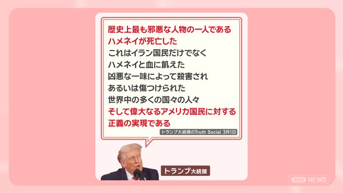 「歴史上最も邪悪な人物の一人であるハメネイが死亡した。これはイラン国民だけでなく、ハメネイと血に飢えた凶悪な一味によって殺害され、あるいは傷つけられた世界中の多くの国々の人々、そして偉大なるアメリカ国民に対する正義の実現である」と自身のSNSに投稿しました。