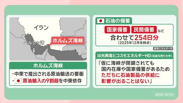 「仮に海峡が閉鎖されても、国内在庫や国家備蓄があるためただちに石油製品の供給に影響が出ることはない」としています。