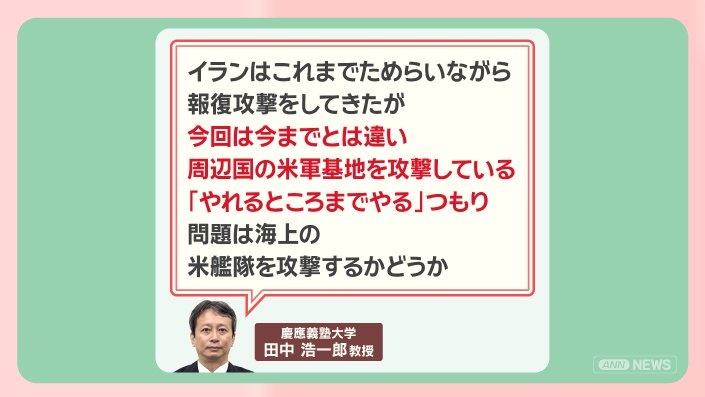 「イランはこれまでためらいながら報復攻撃をしてきたが、今回は今までとは違い、周辺国の米軍基地を攻撃している。『やれるところまでやる』つもり。問題は海上の米艦隊を攻撃するかどうか」