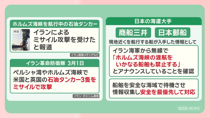 日本の海運大手の商船三井と日本郵船は、現地近くを航行する船が入手した情報として、イラン海軍から無線で、「ホルムズ海峡の渡航をいかなる船舶も禁止する」とアナウンスしていることを確認しました。